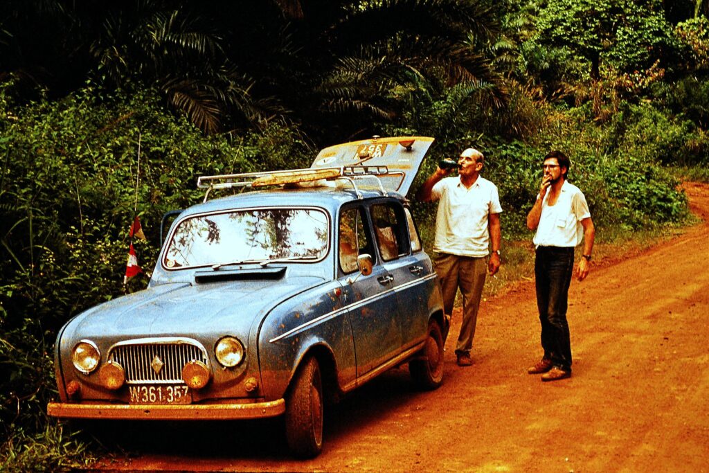 Ernst Haller and Alfred Radda, with the R4 sent from Austria to Cameroon for the expedition.